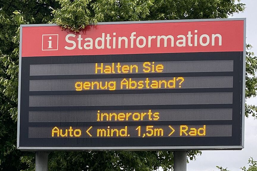 „Beim Überholen von Radfahrenden sind 1,5 m Mindestabstand einzuhalten“ – auf diese Regelung machen aktuell die digitalen Anzeigen an Erfurter Ortseingängen aufmerksam. Die Stadt Erfurt beteiligt sich damit an der thüringenweiten Abstandskampagne.
